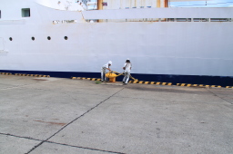 | おが丸を係留していたロープが外されてゆきます。 | |