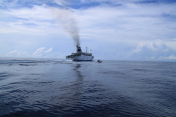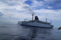 | 私が乗せてもらったPAPAYAの見送りは一番最後まで 追いかけていました。 そして船はゆっくりと遠ざかってゆきました。 |