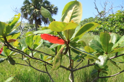 | 花が咲いているのかと思いきや、葉っぱが真っ赤になっています。 紅葉するらしいです。 |