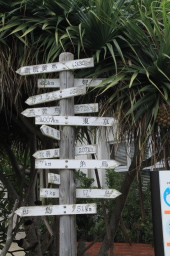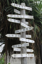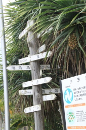 | 役場の角の交差点にあった標識です。 各島の位置と距離が書かれています。 |
