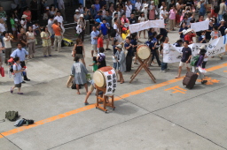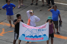 | 太鼓が打ち鳴らされる中、手を振る人々に見送られつつ、 船はどんどん港から離れてゆきます。 |