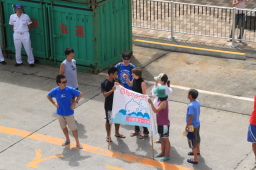 | ユースホステルの人は港の端まで来て旗を振り続けて くれていました。 |