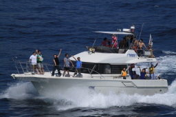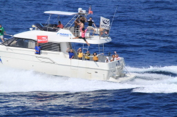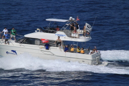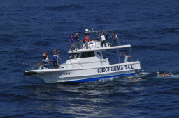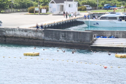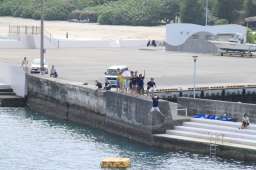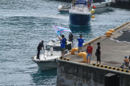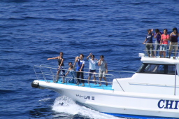 | 父島タクシーの飛び込みが終わり、海の中からも船の上からも みんな手を振ってくれています。 |