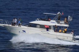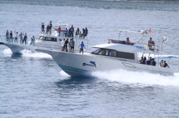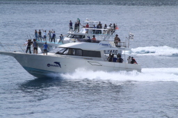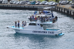 | ツアーでお世話になった父島タクシーの船です。 お見送りの人がずいぶん乗っています。 観光シーズンが間近に迫っているようです。 |