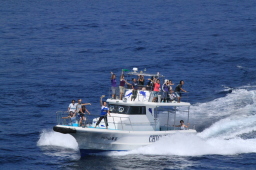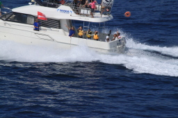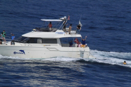 | 残りはPAPAYAの船だけとなりました。 ユースホステルのヘルパーさん達が乗っています。 一人は上半身裸で2階席に、もう一人はライフジャケットを着て 船の横にいます。 ということは… |