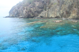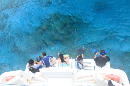 | 兄島海中公園です。 水が澄み、波もほとんどないため、船の上から海底の様子が はっきりと見えています。 |