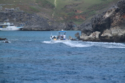 | 同じ船に乗っていた人たちがPAPAYA Jr.で南島に上陸します。 ガイドの皆さんは全て上陸して、船長と客2人だけがMis. PAPAYAに残りました。 奥には先に上陸していた父島タクシーの船がいます。 PAPAYA組は南島での昼食だったようです。 上陸していた時間からして、父島タクシーの方も同様だったと思われます。 |