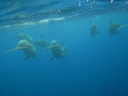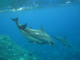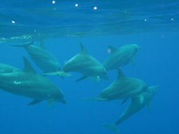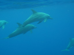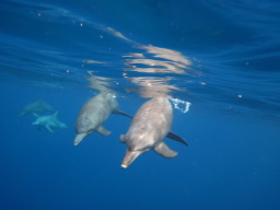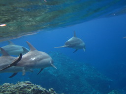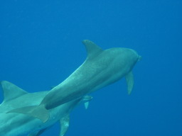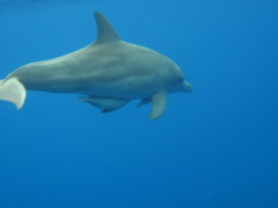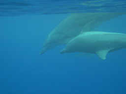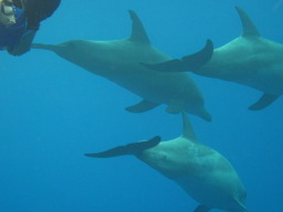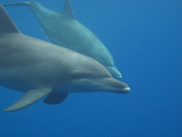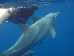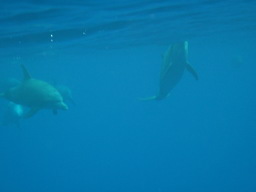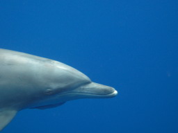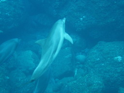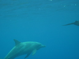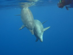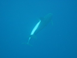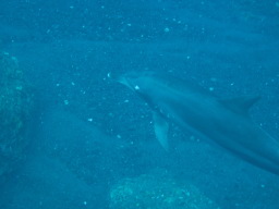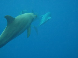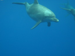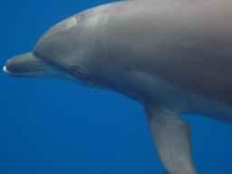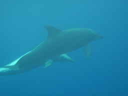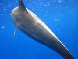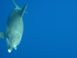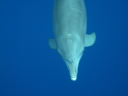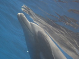 | このイルカは目標を“浮かんでいる人”に定めています。 一緒に泳ぐと分かるのですが、興味があるときにはつぶらな瞳で こちらを見ています。 というか、目が訴えています。 あそぼ〜って。 |