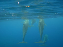 | この1頭はなぜ逆さ? 3頭固まって泳いでいる中での不思議な光景でした。 |