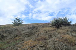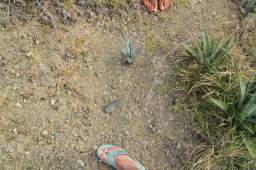 | 帰り道です。 道の上にリュウゼツランの子株が。 こうやって増えてゆくのですね。 ただリュウゼツランは非常に硬くてギザギザの巨大な葉が広がってしまうので、 この場所で大きくなられると、ちと困りものです。 |