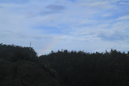 | 来たときとは少しだけ違うルートで入口の林に戻ってきて、旧住居跡の説明を聞いていた あたりで雨が降ってきました。 みんな十分泳いでいるので多少濡れるのはあまり気にしていませんでした。 浜で船に乗る直前に振り替えると林の上に虹が… ケータ島の涙雨とお別れのプレゼントをもらった感じでした。 |