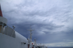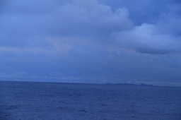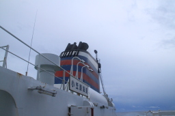 | 雲の帯が延々続いています。 船と父島をつなぐ紙テープのようです。 |