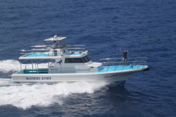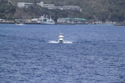 | 船は昨日の大波で1時間25分遅れで到着です。 午後のツアーなども心配でした。 そんな状態でしたが、二見港に入ると1隻の船が近づいてきます。 |