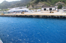 | 「PACIFIC VENUS」は定期船ではないからか、大きすぎるからか、 港の岸壁には接岸しておらず、小船で橋渡しをしていました。 |