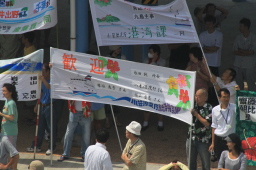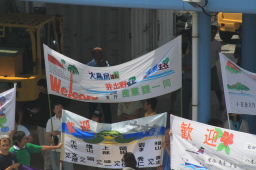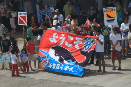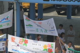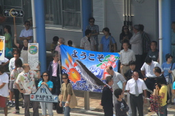 | 今回の船が特別なことは、出迎えでも分かります。 いつもは宿の看板や旗がはためいているはずなのに、 今回は職場の歓迎の旗がはためいていました。 小学校の歓迎旗はかわいらしいクジラです。 |