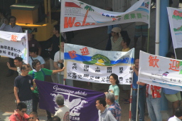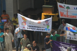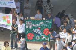 | 産業課、土木課、亜熱帯植物センターなど、職場の歓迎旗で いっぱいです。 |