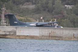 | 朝、出発前に宿で歯を磨いていたら、宿の前をパトカーと 救急車が通りました。 向かった先には自衛隊の敷地があります。 案の定、飛行艇が飛んできました。 この飛行艇は新型なのだそうです。 島の人もカメラを片手に前浜に向かっていました。 |