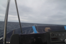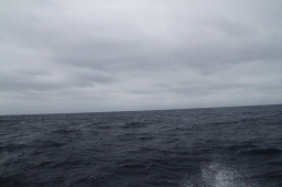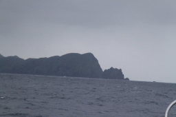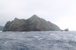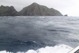 | この写真だとよくわかりませんが、目で見たときには 微妙に赤くなっている場所が、ぎりぎりですが見えました。 晴れていたら赤いハートが見えていたはずです。 そう、中間地点から見た父島ハートロックです。 ハートがこっちを向いています。 船の針路、すなわち母島に向けられたハートなのです。 |