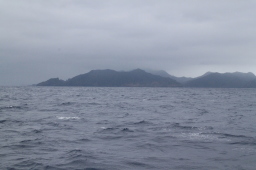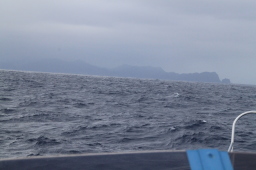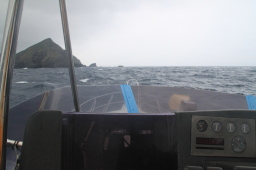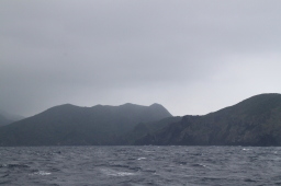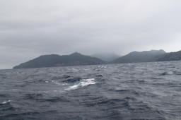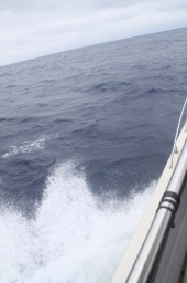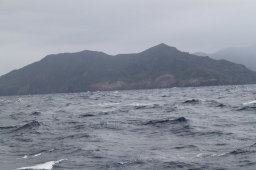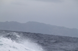 | 母島が少しずつ大きくなってきました。 しかし、左側(東側)が全く見えていません。 相当荒れている模様です。 しかしこの日は東側からぐるっと一周するのです。 きあいだぁ! |