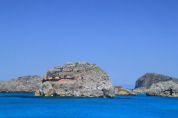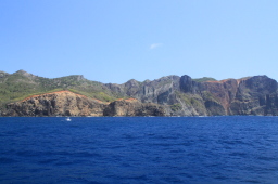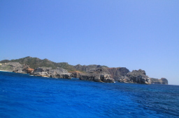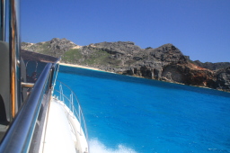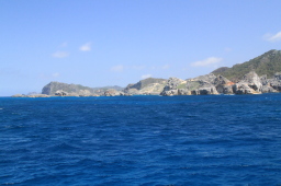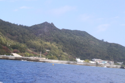 | 出航時の二見湾です。 左が烏帽子岩、右が父島です。 もちろんこれは逆光の失敗写真ですが、今回発の逆光になる ほどの日差しでした! |