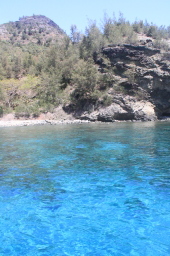 | 海面に反射した光がまぶしいです。 奥の濃い青の場所は急に深くなっているところです。 ここは、船を係留しているあたりから後ろが急に深くなっていて、 流れも非常に速いのです。 |