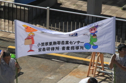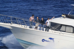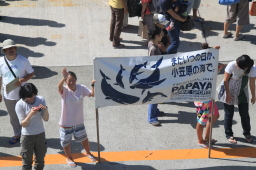 | PAPAYAのお見送りです。 旗には「またいつの日か、小笠原の海で」の文字が… いつかではなく、すぐにでも行きたいものです。 |