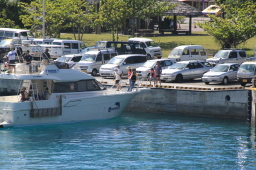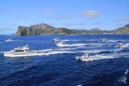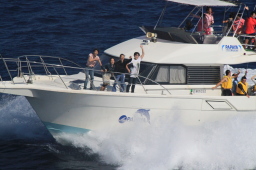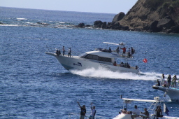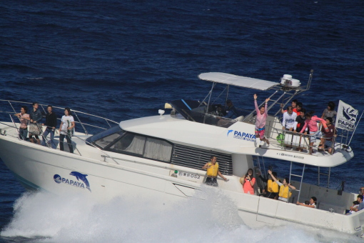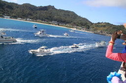 | 烏帽子岩のあたりで、ようやくMis.PAPAYAがきました。 いつも一番最後までお見送りしてくれるのですが、 お見送りの人を乗せたりで、最後尾から一番離れた位置をキープしての出だしです。 |