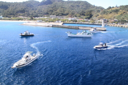 | お見送り船がおが丸の通過を待っています。 お見送り船はおが丸の後ろから追いかけてくるからです。 |