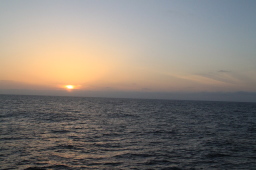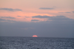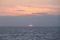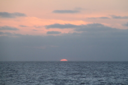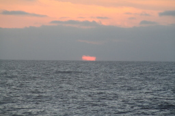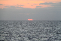 | 上半分が完全に見えています。 太陽の後ろに雲があるようにしか見えません。 実際に見ているときには、水平線上に沈む太陽が見れた ことに興奮して、この不思議さに気付きませんでした。 |