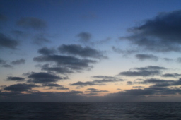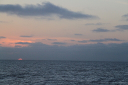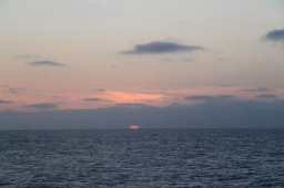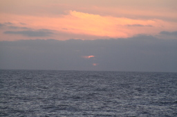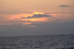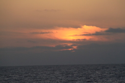 | 太陽が、水平線ではなく遠くの雲に沈んでゆきます。 |