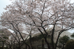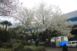 | 隣の桜は種類が違うようです。 白い花弁ともに、葉が出ています。 |