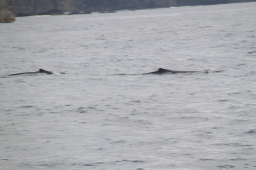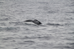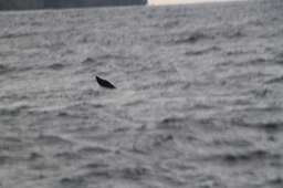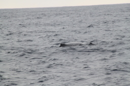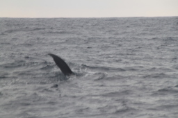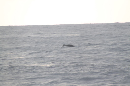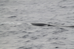 | なぜか尾びれが横倒し。何回もありました。 子クジラに授乳中ではないか?との船長コメント。 |