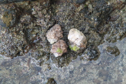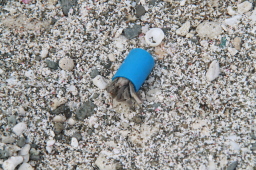 | 海岸に戻ってきて、船を待っているとガイドさんが 見つけてくれました。 プラスチックヤドカリです。 いい住処が無かったんですねぇ〜 |