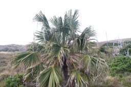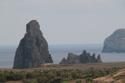 | 頂上にある、オガサワラアザミです。 ヤギにほぼ食べつくされたのですが、 数株残っていて、少しずつ増えているそうです。 で、葉っぱの上に何か居ます。 |