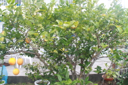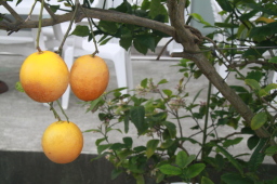 | PAPAYAの庭になっている島レモンです。 収穫時期はとっくに終わっていますが、パーティーのときに ジントニック用に出てくるので、見せるためにいくつか 残してあるのだそうです。 |
