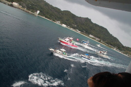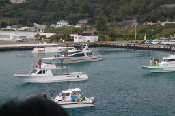 | 一番奥で一隻だけ反対を向いているのが、Mis.PAPAYA です。 これからお見送りに来る人を乗せるために逆を向いています。 ほかの船はおがさわら丸を追跡する体制に入っています。 |