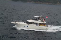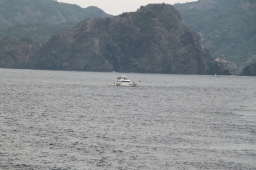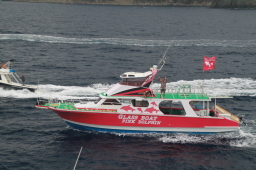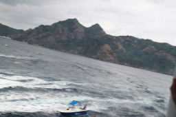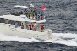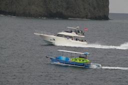 | 最後はいつもMis.PAPAYAです。 ほかの船は二見湾の入り口辺りでダイブですが、 Mis.PAPAYAは延々西島と並ぶ辺りまで追いかけて くれた後にダイブとなります。 |