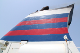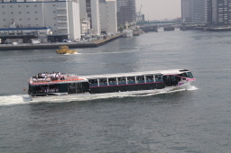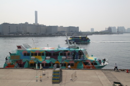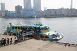 | 船の大きさに対して、後ろがやたらといかつい! 東京湾を出たら、暴走族状態の予感。 そういえば、昔行った西表島へ行く船も巨大な水しぶき を高々と上げながら進む高速船でした。 |