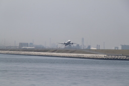 | 飛行機がバンバン離陸してゆきます。 ちなみに、着陸もバンバン来ます。 着陸する機体は、左の方から飛んできて、海沿いに右に向かって 降り立ちます。 滑走路が離陸用と着陸用で交差しているようです。 |