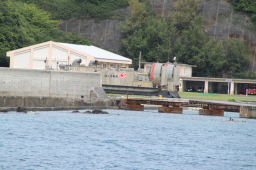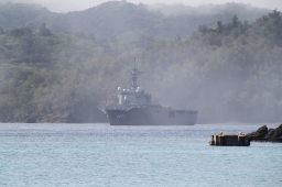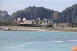 | ホバークラフトを乗せてきた自衛隊の船です。 夜のうちに入港したようです。 |