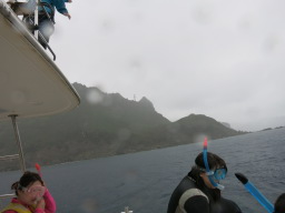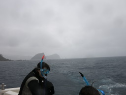 | 海から上がった方がかえって寒かったりしています。 雨だし、船は高速で風が強いし。 本当は体力温存も含めて聟島に一直線で向かいたいところ だったのですけれど… でも、イルカが出ちゃったら入るしかないですしねぇ… |