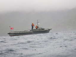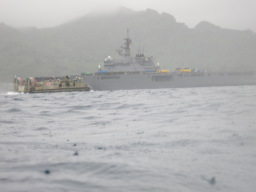 | こちらは連絡船なのだとか。 島に停泊中は、自由時間になる人や、島の基地に行き来する 人もいるらしく、船と島の間を定期便が出るのだとか。 |