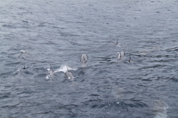 | 船が円を描くように回ると、当然ひき波が円を描きます。 そのひき波にイルカの群れが躍るのです。 |
