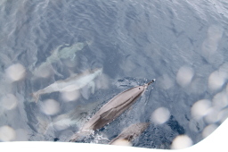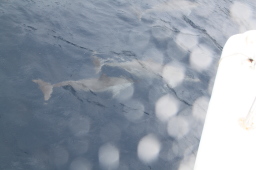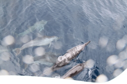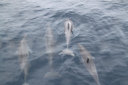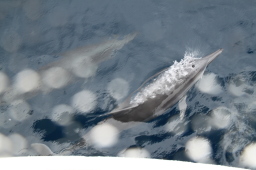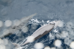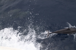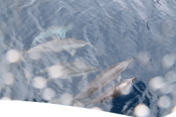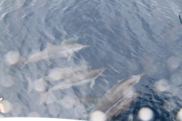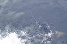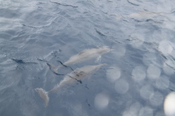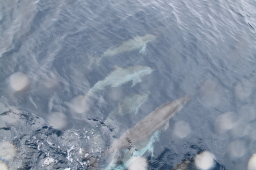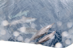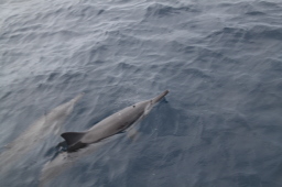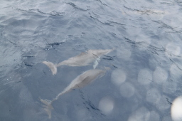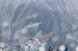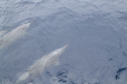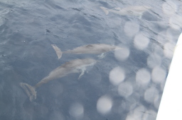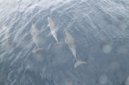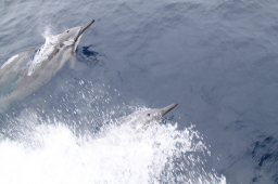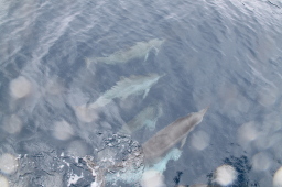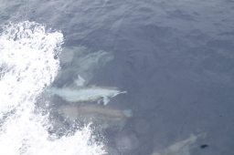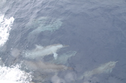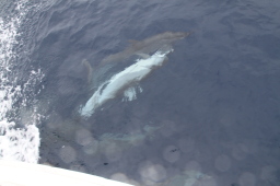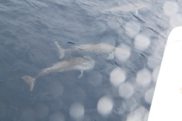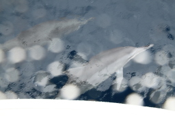 | 船の下では、もうノリノリのイルカたちがいました。 本来ハシナガイルカは夜行性で夕方起きてきて 餌を求めて外洋に出ます。 この日は朝早くだったので、まだ起きていたようです。 |