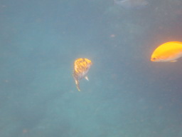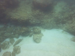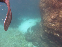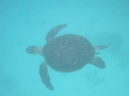 | でました! カメ水路の主、アオウミガメです。 多いときにはもっとたくさんいるそうですが、 この日はこの一匹だけでした。 甲羅が岩のようで、ガイドさんに教えてもらわなければ 最初は分かりませんでした。 |