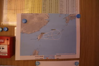 行きの船の4デッキ案内横に張り出されていた天気図(左)と台風進路(右)の写真です。