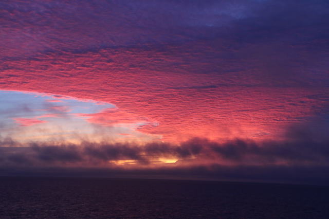| おがさわら丸から見た朝焼けです。 今回は梅雨前線の影響を行きも帰りも受けました。 おがさわら丸からの焼けた空は、朝夕4回のチャンスの中で行きの朝1回だけでした。 それにしても不思議な焼け方です。 |