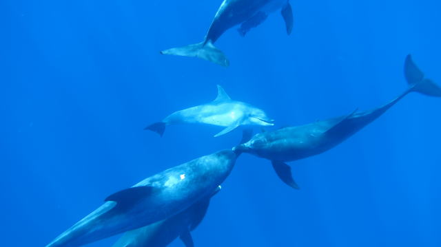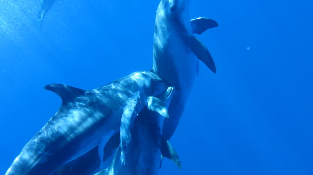 | 小笠原の海は生き物の宝庫。 今回はたくさんのミナミハンドウイルカとの出会いがありました。 ツアーは全部で4回行きましたが、初日のイルカです。 イルカ同士でひたすらもみくちゃになって遊んでました。 |