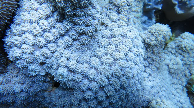 | 父島の海といえば、もう一つ。 キャベツビーチの色とりどりのサンゴたち。 ちょうど潮が入ってきているところだったため流れがそこそこあって、 サンゴたちが一斉に触手を出してプランクトンをほおばっていました。 流れに揺られる姿がとてもきれいでした。 |
