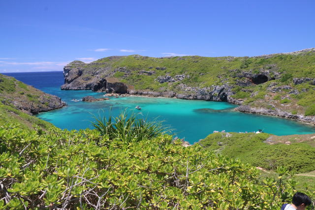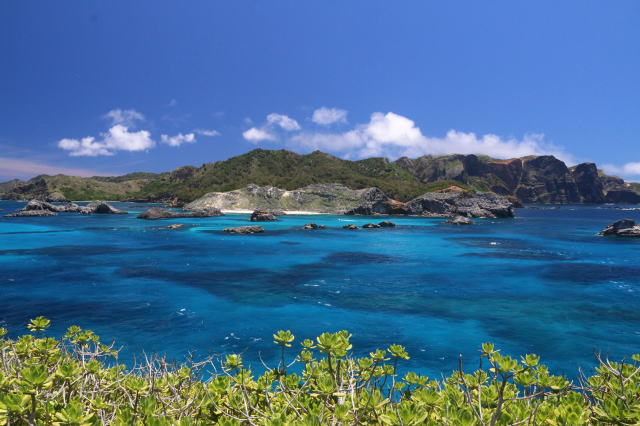 | 晴れた日の南島はとてもきれい。 小笠原を象徴する色である青が、こんなにたくさん種類があるのを目の当たりにできます。 東尾根から、南島瀬戸とサメ池です。 |